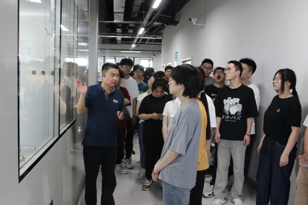 隨后,制造中心半導體生產負責人楊帥邦帶領學生們來到半導體制造車間,現場觀摩生產過程、詳細為同學們講解半導體業(yè)務及產品相關設備的使用場景。